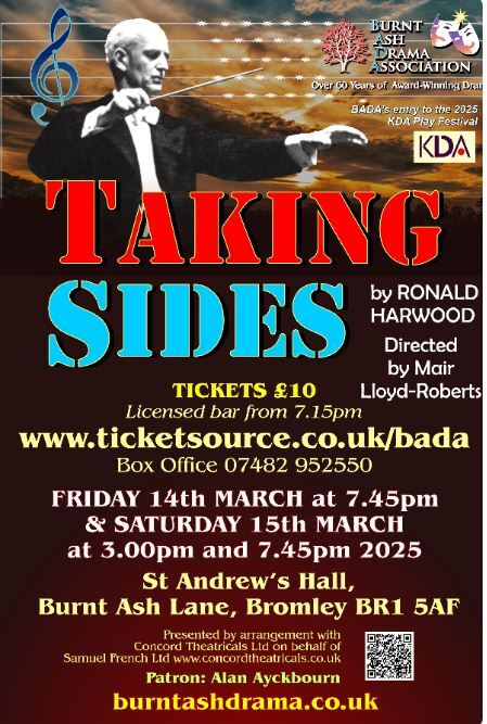 Burnt Ash Drama Association (BADA)are thrilled to announce that Taking Sides will now be staged in March (Friday 14th & Saturday 15th) with a matinée performance on the Saturday.