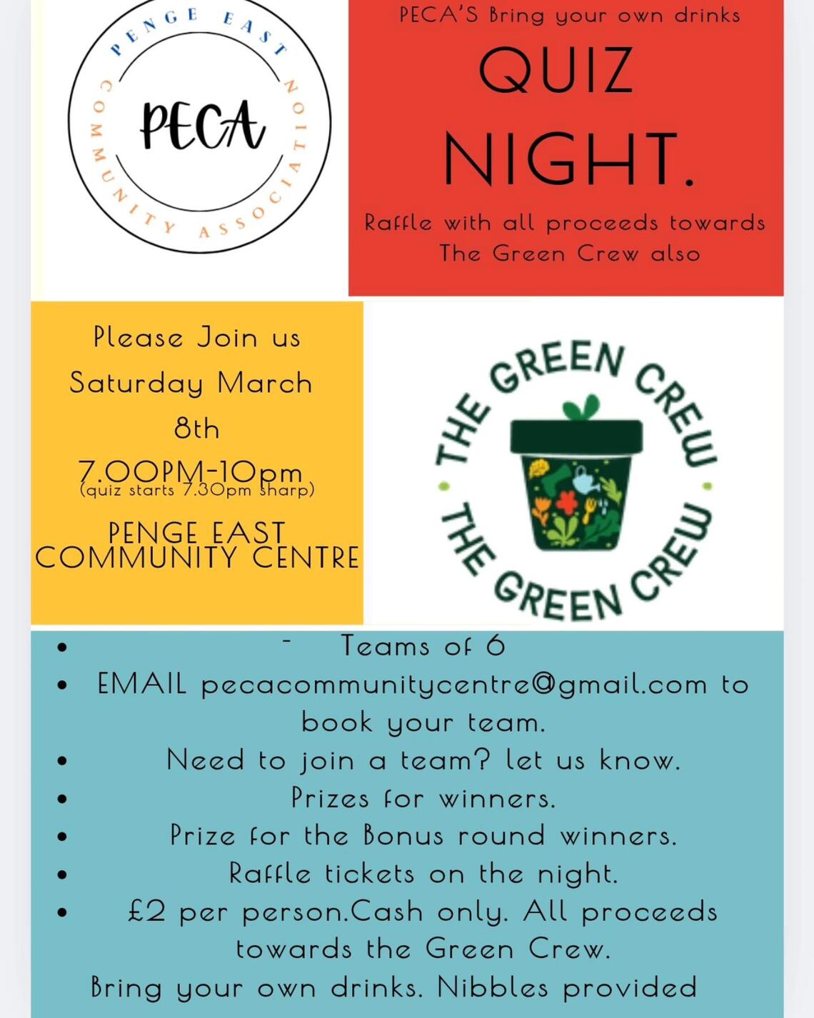 Join PECA on Saturday 8 March 7.00 -10.00pm (quiz starts 7.30pm Sharp) at Penge East Community Centre.