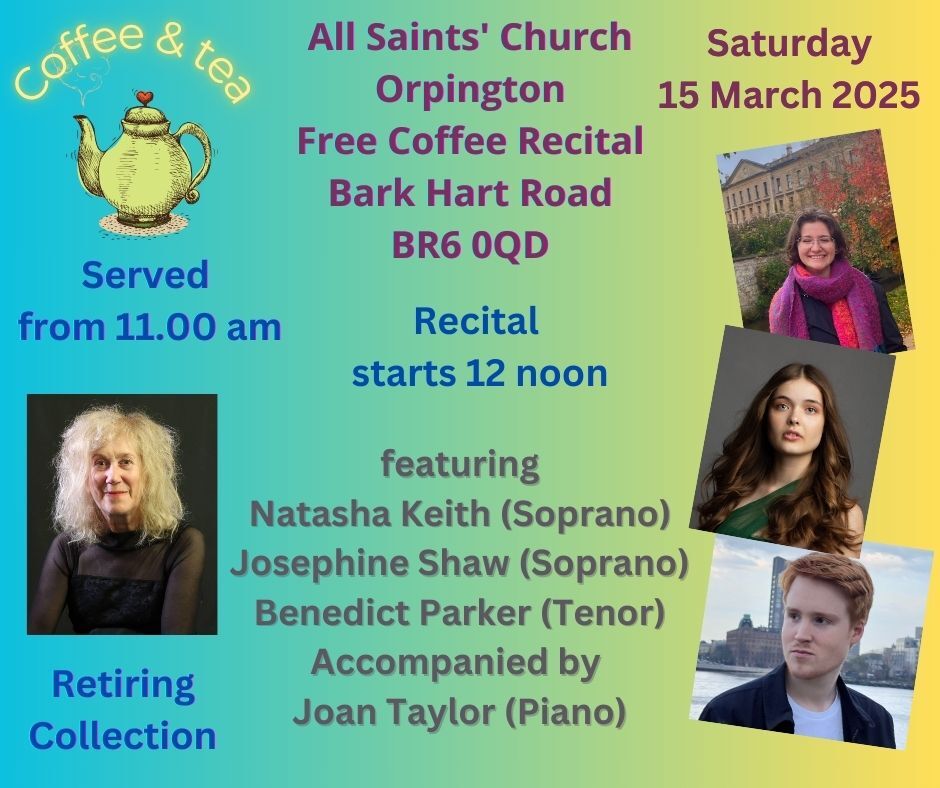Join All Saints Orpington on Saturday 15th March at 11.00am for their Coffee Recital welcoming Natasha Keith (Soprano), Josephine Shaw (Soprano), Benedict Parker (Tenor) accompanied by Joan Taylor (Piano).