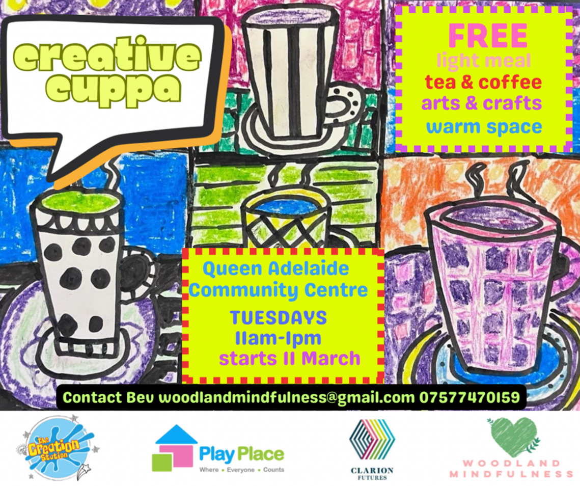 CREATIVE CUPPA is led by Cathy from The Creation Station and Bev from Woodland Mindfulness in a partnership with PlayPlace with funding from Clarion Futures.