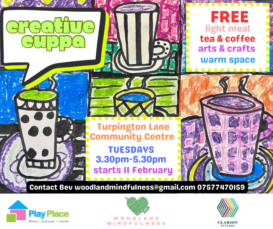 CREATIVE CUPPA is led by Creative Therapist, Bev from Woodland Mindfulness in a partnership with PlayPlace with funding from Clarion Futures.