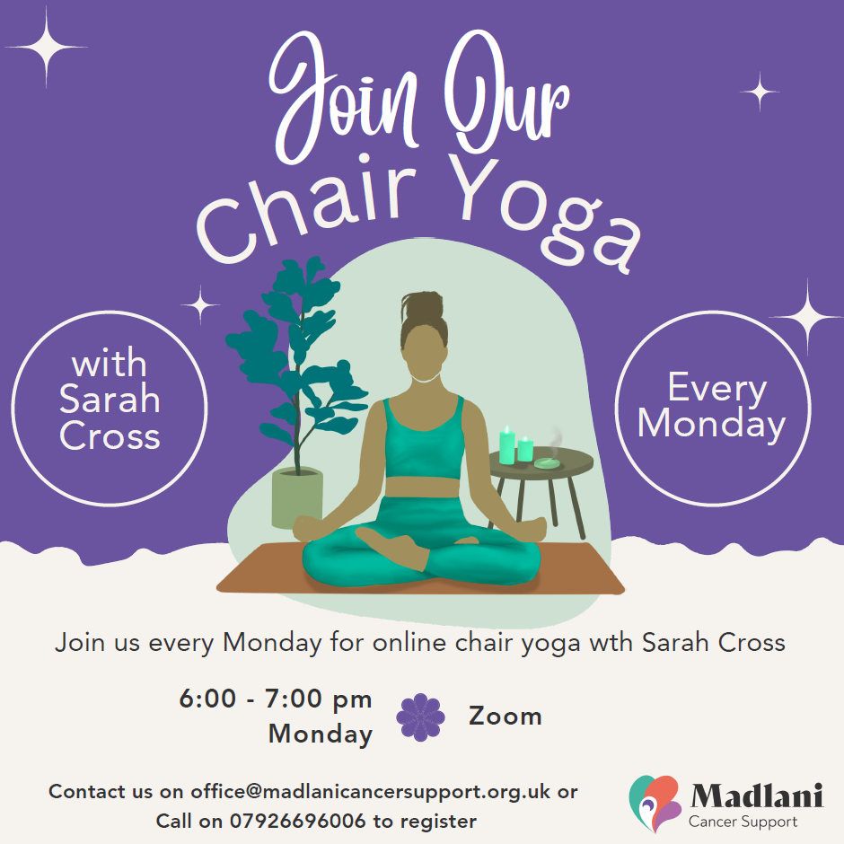 Joins Madlani Cancer Support for Online chair yoga every Monday. Sarah has trained in yoga for cancer and her sessions are proving to be popular and is just perfect for mobility work on a Monday evening. A donation of £5 is requested but not mandatory.