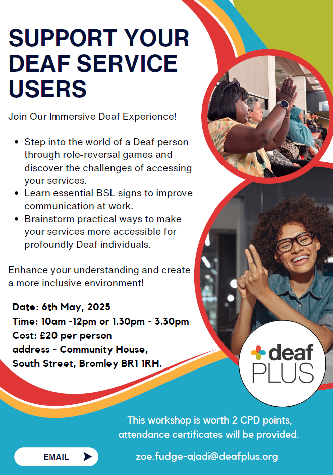 deafPLUS are holding a Deaf Awareness Event on Tuesday 6th May. Two sessions available, 10.00am - 12.00pm and 1.30 - 3.30pm
