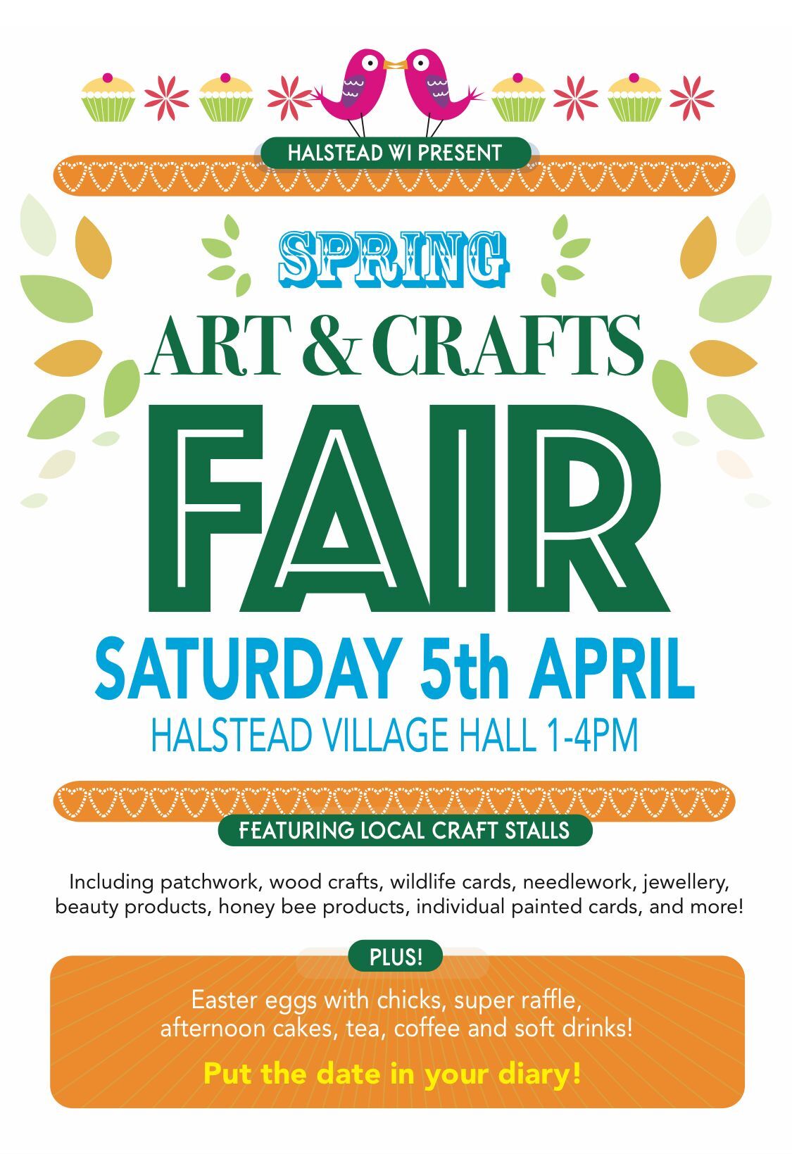 Halstead WI present Spring Art & Crafts Fair, featuring local craft stalls including patchwork, wood crafts, wildlife cards, needlework, jewellery, beauty products, honey bee products, individual painted cards, and more!