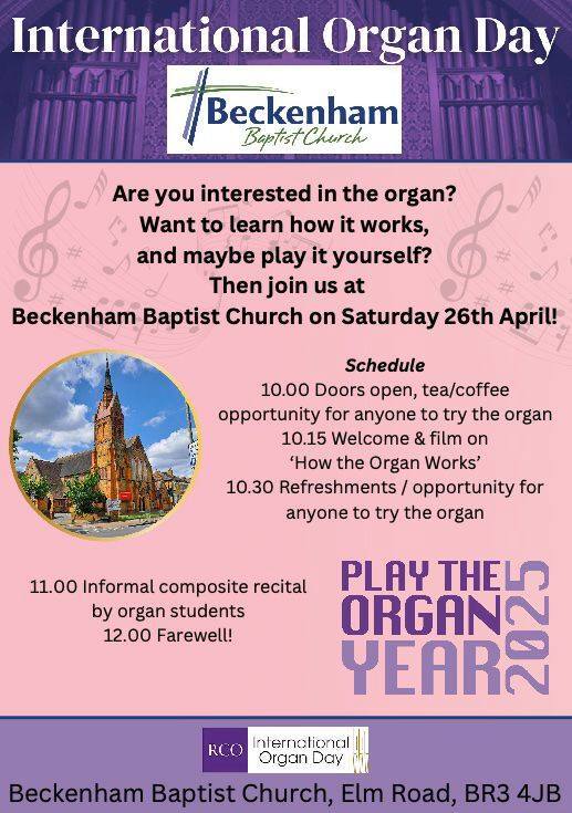 If you're interested in the organ, want to learn how it works, and maybe play it yourself, join this event at Beckenham Baptist Church on Saturday 26th April!