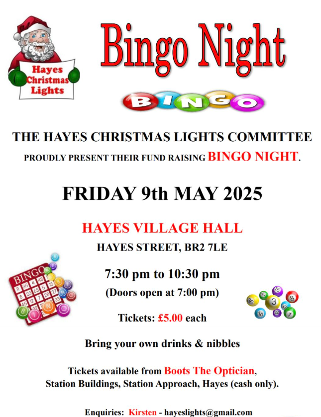 Join the Hayes Christmas lights committee on Friday 9th May, 7.30 - 10.30 pm (Doors open at 7.00 pm) for their fund-raising bingo night at Hayes village hall, Hayes Street, BR2 7LE.