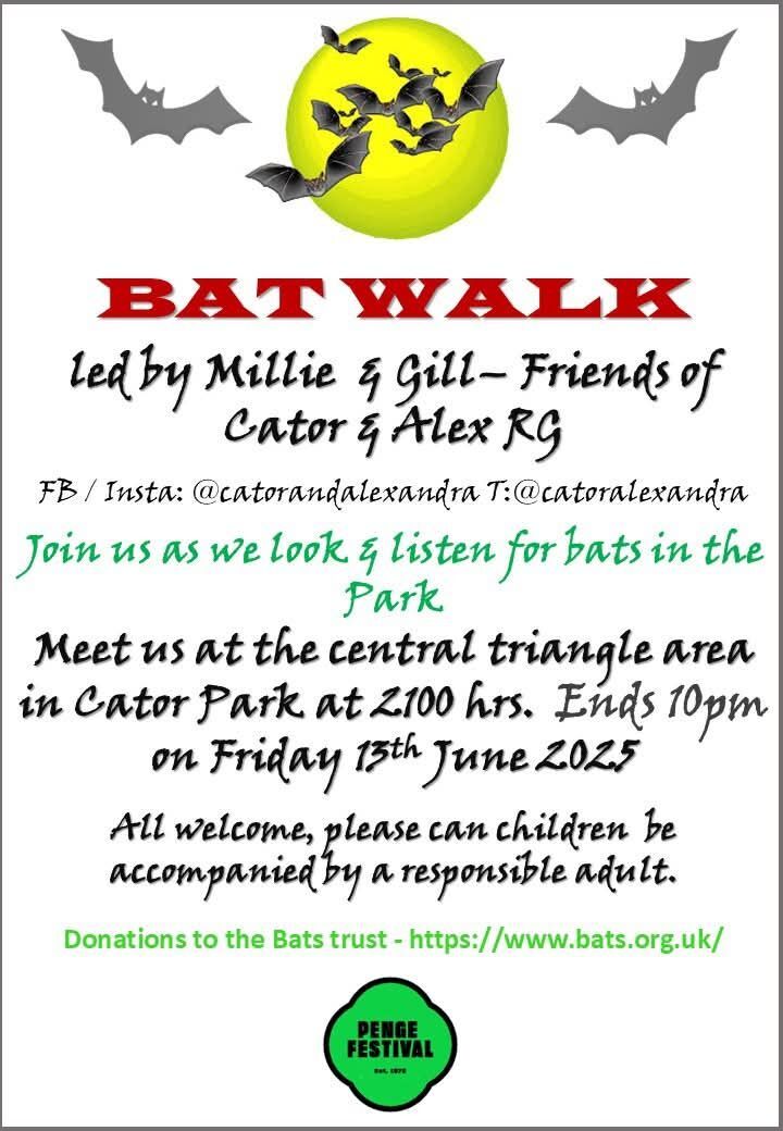 Back for another year, join The Bat Walk on Friday 13th June 9.00 - 10.00pm with Millie & Gill and The Friends of Cator and Alexandra. Meeting point, the central triangle area in Cator Park.
