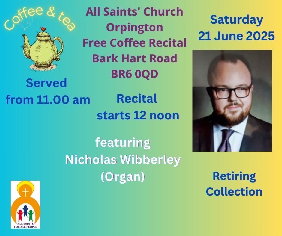 Join All Saints Orpington for their free Coffee Recital on 21 June with Nicholas Wibberley.