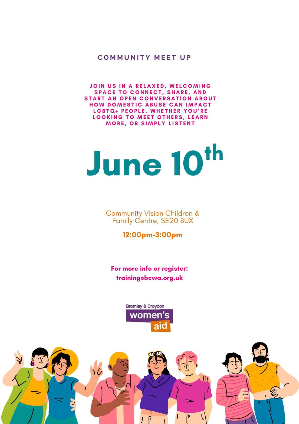 Join Bromley & Croydon women's aid on 10 June, 12.00 -3.00pm in a relaxed, welcoming space to connect, share and start an open conversation about how domestic abuse can impact LGBTQ+ people whether you're looking to meet others, learn more, or simply listen