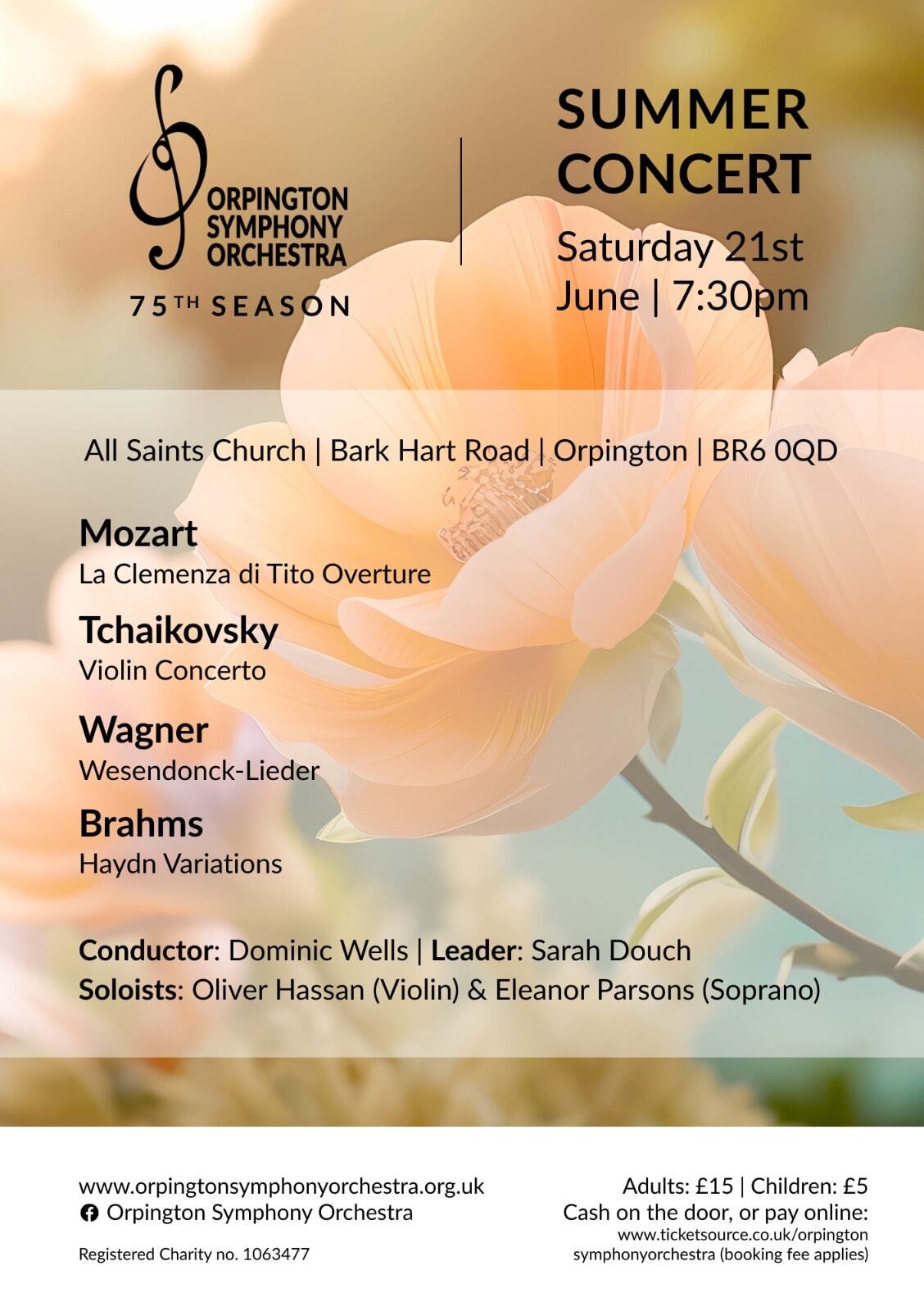 Join Orpington Symphony Orchestra for their 75th Season Summer Concert on Saturday 21st June 2025 at 7:30 pm, All Saints Church, Orpington.