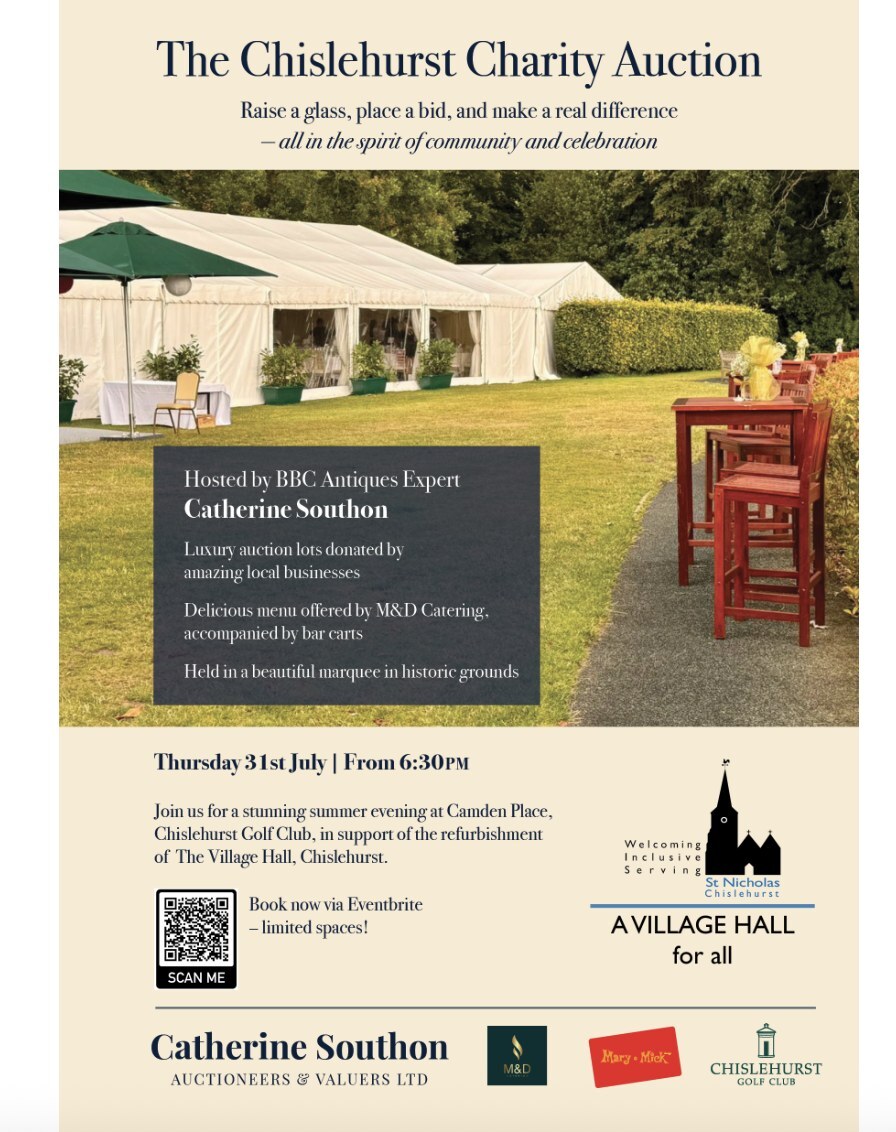 Support St Nicholas Village Hall and have fun at their luxury charity auction on Thursday 31 July at Chislehurst Golf CLub, Camden Place, Camden Park Rd, Chislehurst BR7 5HJ, once the home of the exiled Napoleon III and Empress Eugenie. Great menu.