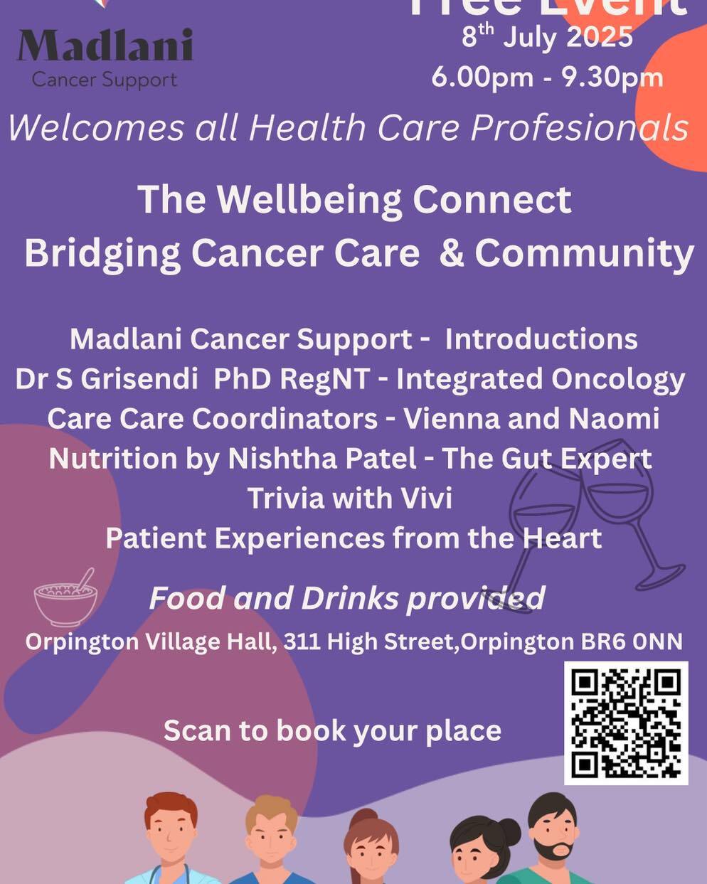 Whether you’re a patient, part of a medical team, or work in healthcare support or admin across Bromley & Orpington — join Madlani Cancer Support for a special evening at Orpington Village Hall, 311 High Street Orpington BR6 0NN.