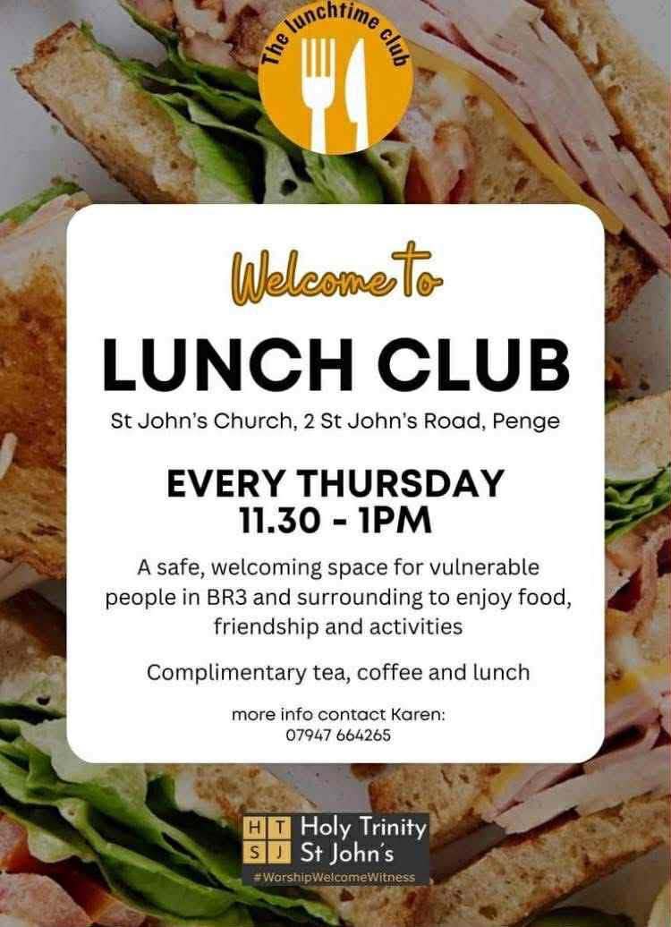 A "Lunch Club" held every Thursday from 11:30 AM to 1:00 PM at St John's Church, Penge.