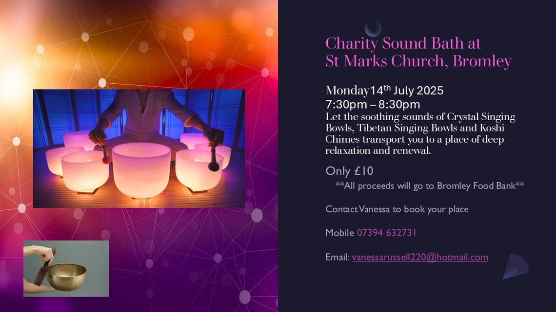 A "Charity Sound Bath" taking place at St Mark's Church in Bromley.