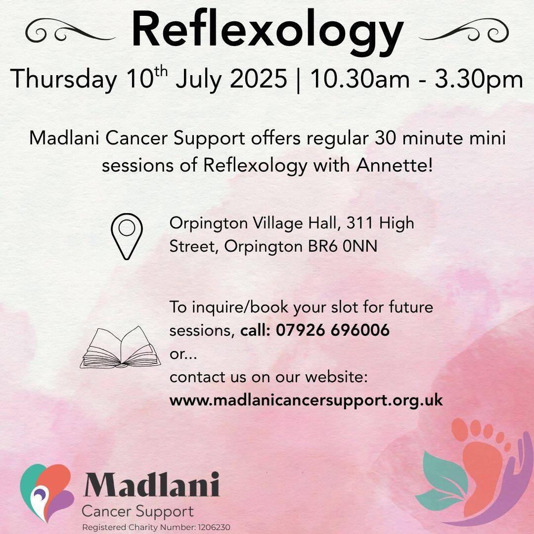 The Reflexology sessions, each lasting 30 minutes, are held with Annette. The next scheduled event is on Thursday, July 10, 2025, from 10:30 AM to 3:30 PM, at Orpington Village Hall, 311 High Street, Orpington BR6 0NN.