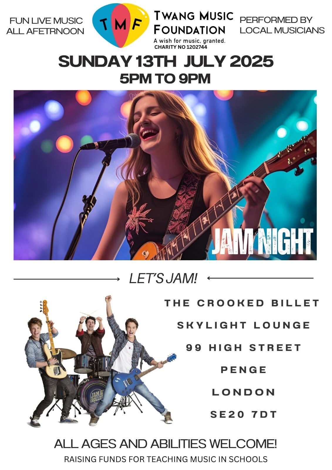 The venue for the Jam Night is The Crooked Billet, Skylight Lounge, located at 99 High Street, Penge, London, SE20 7DT.