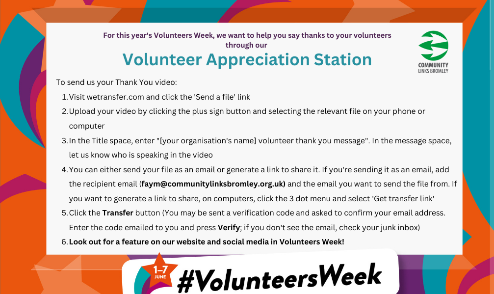 We will make sure your message is posted on our social media platforms during Volunteers’ Week. Please complete the Volunteer Appreciation Station form by Monday 22nd May 2023.